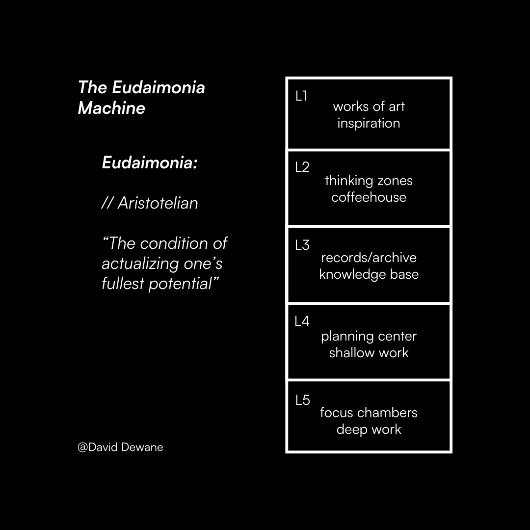 Everything from your schedule, to your habits, to your environment, should reflect a hierarchy that allows you to extract as much value as possible from the full powers of the human brain. The Eudaimonia Machine, conceptualized by David Dewane, gives a beautiful picture of what this might look like.
